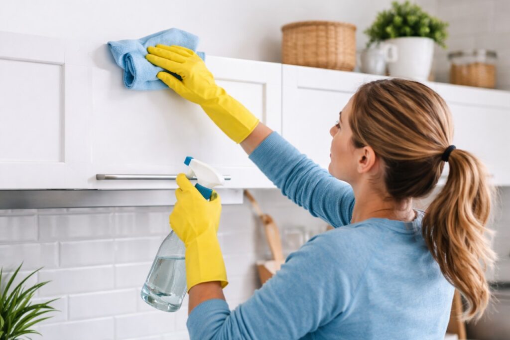 Le dessus des meubles hauts est souvent la zone la plus encrassée, car rarement nettoyée. L’accès y est moins confortable, mais c’est précisément là que la graisse s’accumule le plus. Un nettoyage régulier avec une éponge plate ou un chiffon fixé sur un manche permet d’atteindre ces surfaces sans effort excessif.